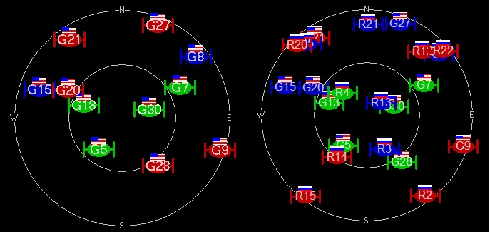 Hierboven een voorbeeld van onze ontvangst in Losser links alleen de satellieten met GPS en rechts de satellieten van GPS en GLONASS.