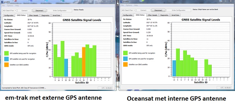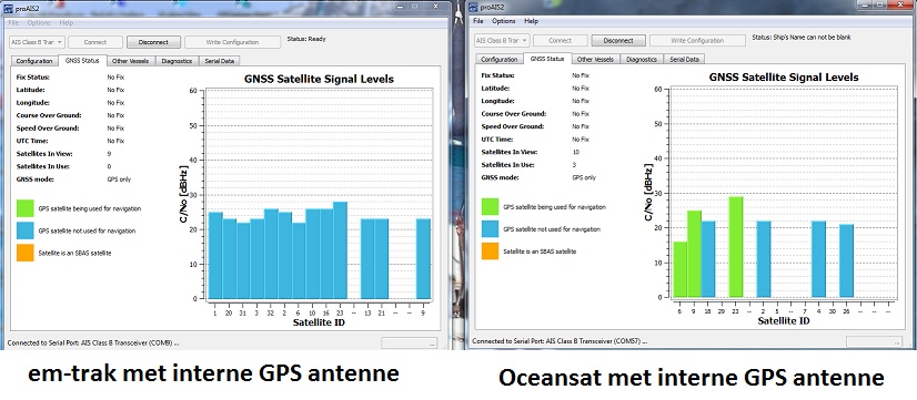 Vreemd is dat bij +/- een waarde van 25 de Oceansat een groen balkje geeft en de em-trak niet, beide hebben hierboven echter geen fix (positie).