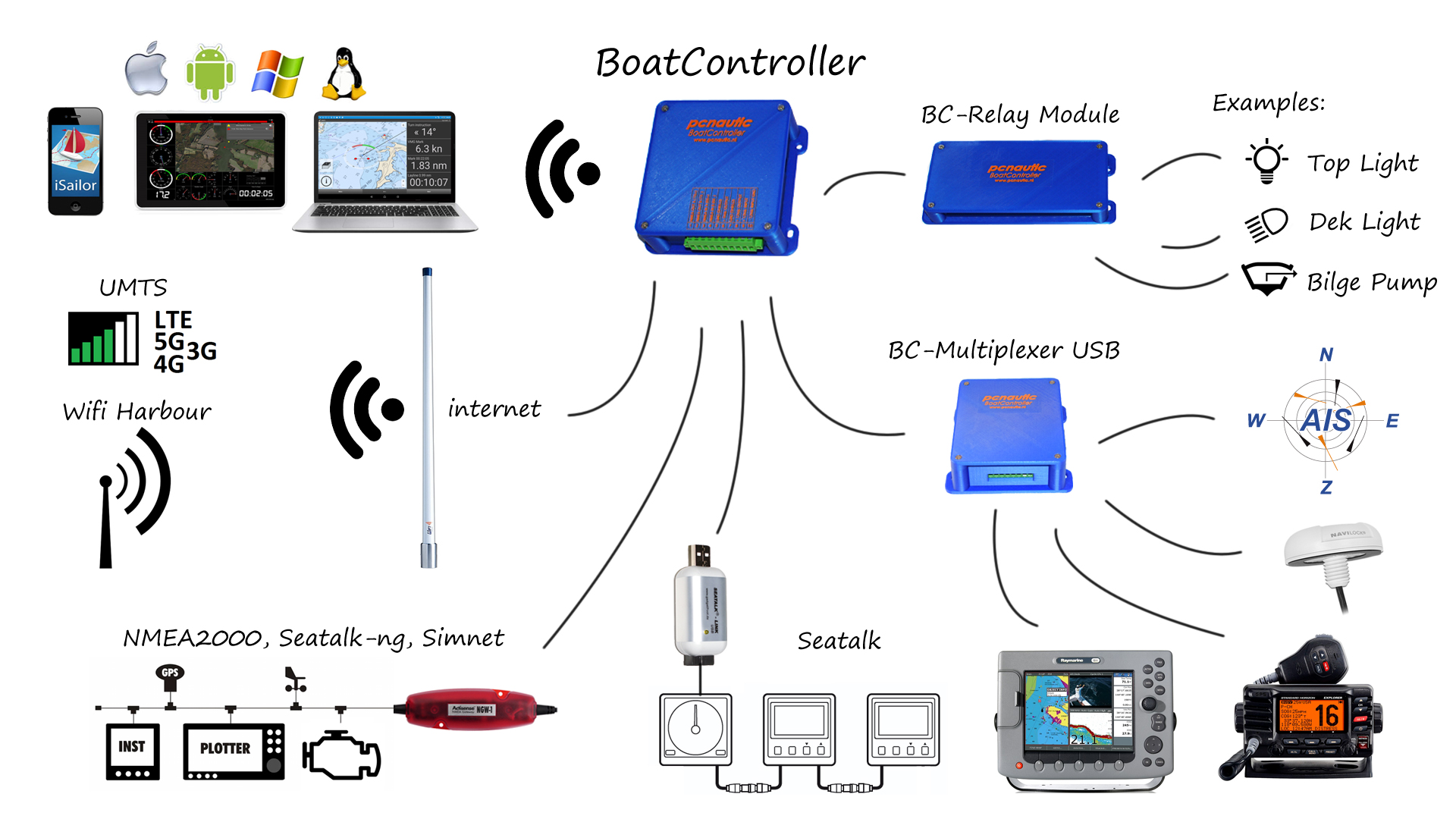De BoatController is o.a. een Wifi Multiplexer, Router en Gateway in één, wat betekent dat hij verschillende instrumenten en apparaten kan koppelen en de informatie kan vertalen voor verschillende systemen en toepassingen.
